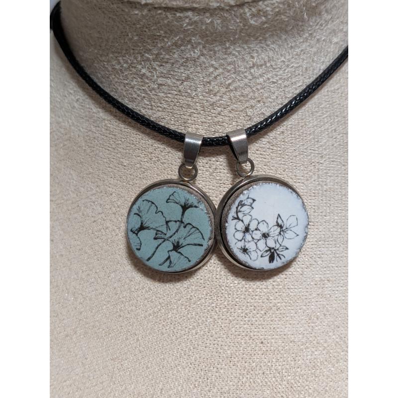 Chaque bijou est une pièce unique, façonnée à la main par la créatrice auvergnate Coline Lespinasse. Réalisés en Pierre de Volvic émaillée, ces pendentifs se déclinent en différents designs et couleurs – vert ou blanc – et sont livrés avec un cordon noir.