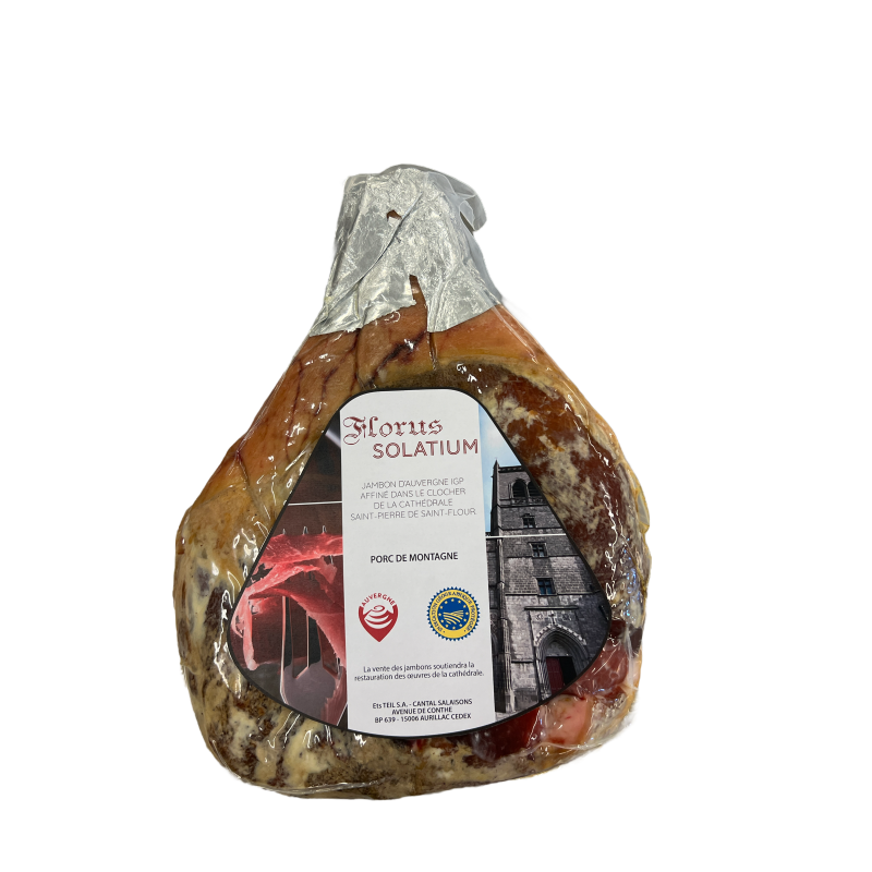 Le jambon Florus Solatium est soigneusement sélectionné parmi les meilleurs cochons élevés dans les Monts du Cantal et de la Margeride. Salé au sel sec, il est ensuite séché à Aurillac, dans les ateliers de Cantal Salaisons, puis affiné dans le beffroi de la tour nord de la cathédrale de Saint-Flour.