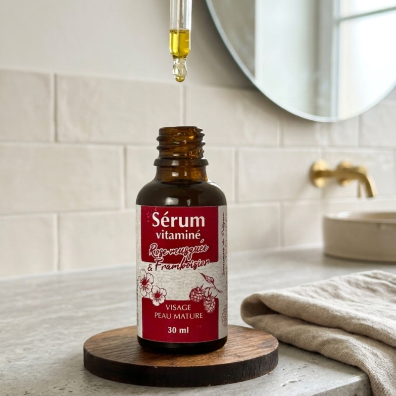 Sérum naturel aux huiles précieuses (rose musquée, argan, framboise) pour nourrir, lisser et redonner éclat aux peaux matures.