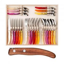 Épatez vos convives avec ce service complet de couverts Laguiole qui réunit 6 fourchettes, 6 couteaux, 6 cuillères à soupe et 6 cuillères à café.